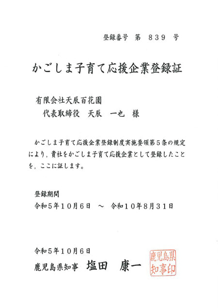 令和5年10月 かごしま子育て応援企業に登録していただきました