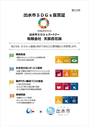 有限会社天辰百花園は、変化する環境において、様々な課題に柔軟に対応し、顧客満足に努め、事業継続を確実にするため、国際規格に適合した3つの認証を取得しております。