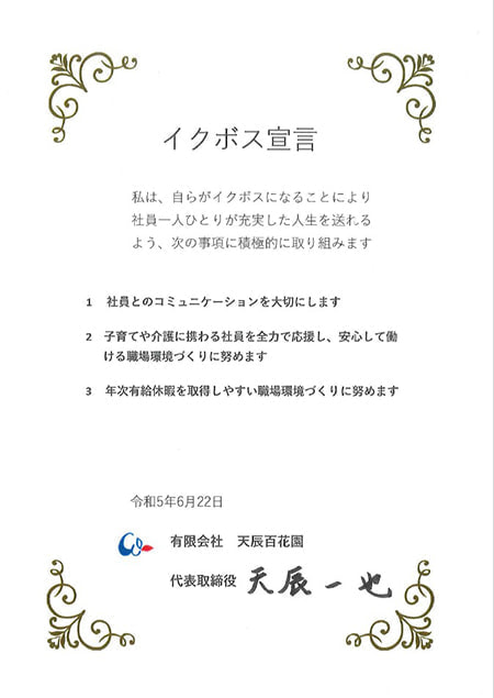 有限会社天辰百花園は、一般事業主行動計画の公表および従業員への周知を行い、働き方改革を推進してまいります。